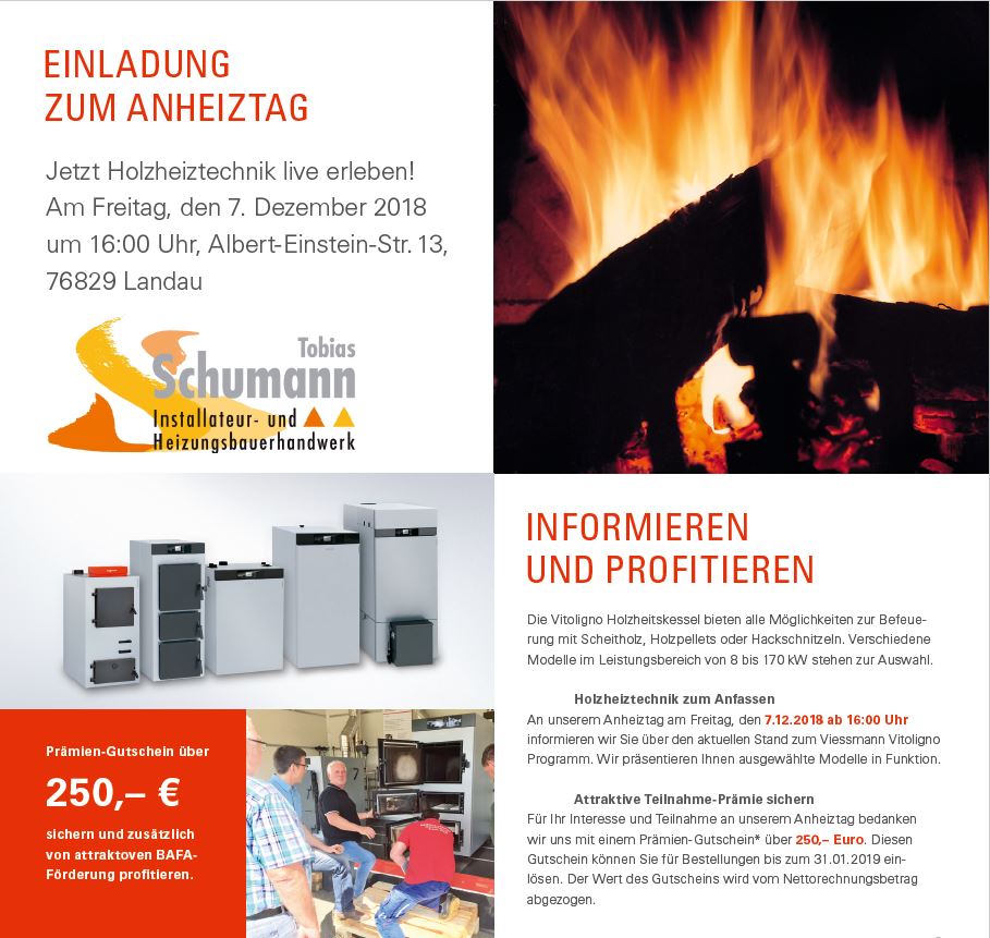 An unserem Anheiztag am Freitag, den 7.12.2018 ab 16:00 Uhr informieren wir Sie über den aktuellen Stand zum Viessmann Vitoligno Programm. Wir präsentieren Ihnen ausgewählte Modelle in Funktion.