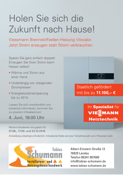 Und das mit einer unglaublichen staatlichen Förderung von bis zu 11.100,– € und 10 Jahren Garantie aus dem Hause Viessmann. Lassen Sie sich unverbindlich und kostenlos informieren, kommen Sie zu unserem Infoabend am: